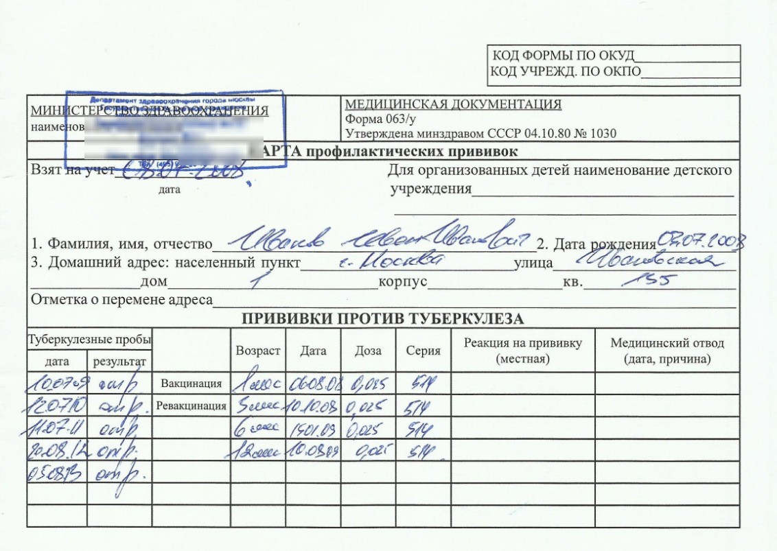По закону, все данные о полученных прививках несовершеннолетнего, заносятся в специальную карточку, которая требуется при поступлении ребенка в образовательное учреждение. Карта профилактических прививок 63 понадобится как при зачислении ребенка в детский сад, так и при поступлении в ВУЗ.