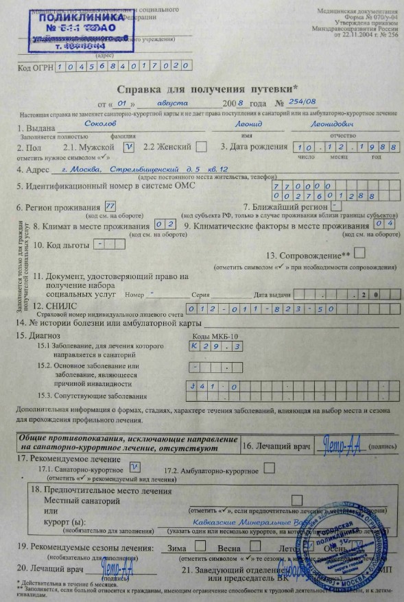 Сразу стоит отметить один важный момент. Наличие справки 070 у для получения путевки еще не гарантирует, что вы эту самую путевку получите. Однако присутствие данного документа, в значительной мере увеличивает ваши шансы на получение соответствующего лечения.